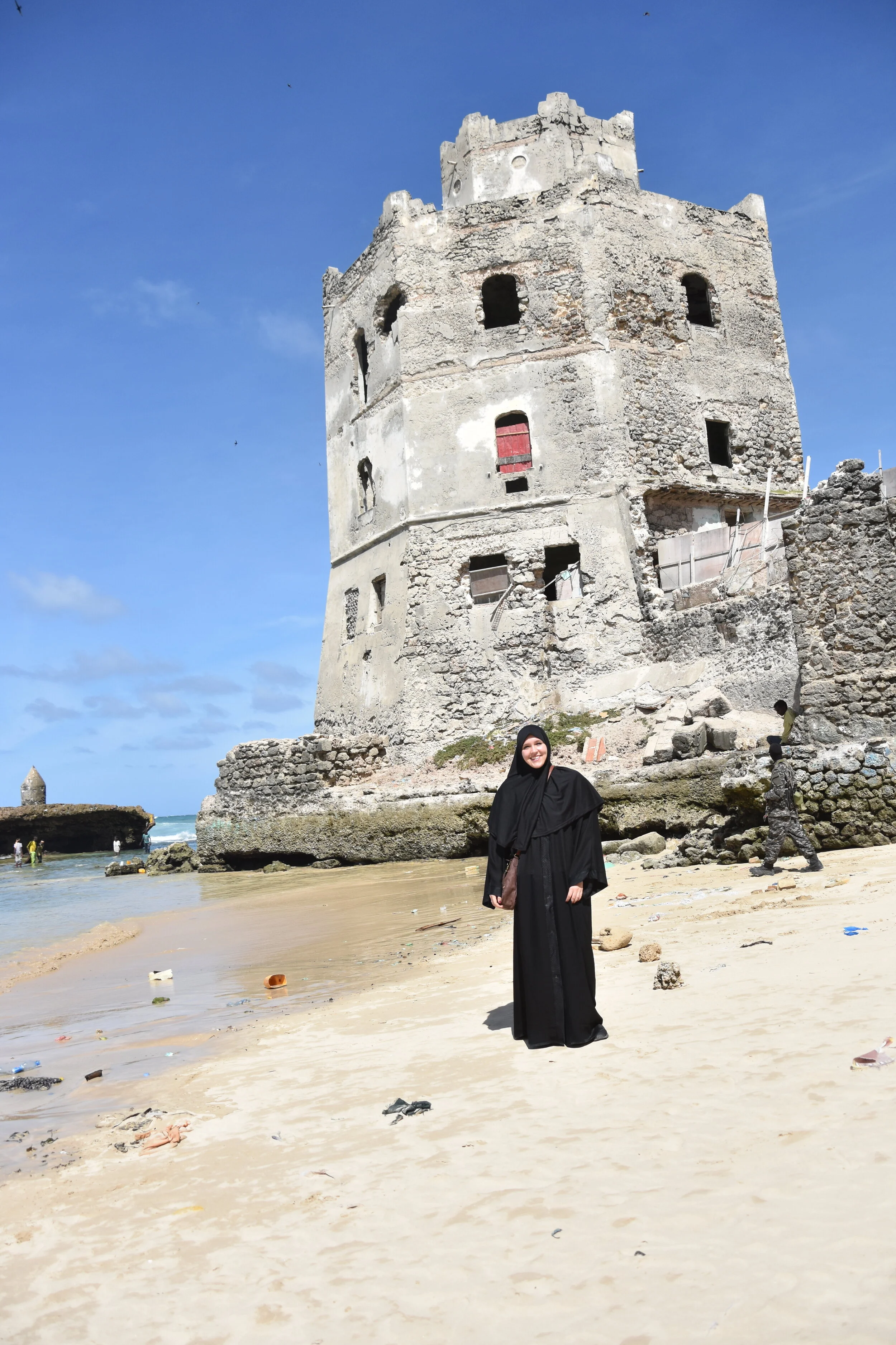 I walked for approximately five minutes before Ahmed led me down a steep flight of stairs to Second Lido Beach. This beach is where all the fishermen bring in their daily catch to sell at the fish market. All of the boats were tied up when I got down there. There were teenage boys playing soccer on the beach. It was great to just soak up the sea air and experience the lives of the locals. A crowd began to form at the top of the stairs. As you can imagine, tourists are not too common in Mogadishu so any unknown visitor will cause a seen. Crowds always made Ahmed nervous so he motioned for me to follow him to the Mogadishu Lighthouse. I begged him to go in and after some persistence, he finally caved. The lighthouse was heavily damaged and what used to be a spiral staircase to the top, now had giant caps between the stairs. Some of the guards began to climb the stairs, using the protruding steel beams as stairs when the concrete was missing. I proceeded to follow them. The task turned out to be rather difficult given my Abaya kept getting tangled on the beams. I tried holding up my Abaya so that I could get some footing, but Ahmed scolded me because I was showing too much leg. I decided to discontinue my attempt to get to the top. After I climbed back down, Ahmed made sure I knew I needed to wear full pants under my Abaya tomorrow instead of just shorts. Woops.
